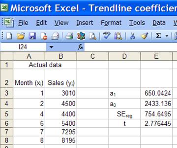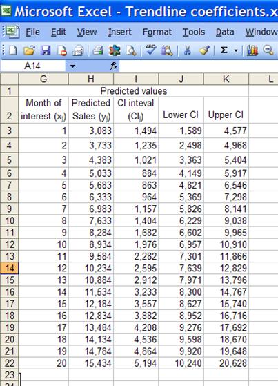 Using regression analysis yields a lot more information than the trendline’s coefficients. The rest of the information is important in understanding how well the regression line fits the data, how significant the individual coefficients are, as well as the significance of the regression as a whole. It also contains key elements needed to build confidence intervals for interpolated or extrapolated estimates, a subject covered in the section titled Confidence Intervals.
