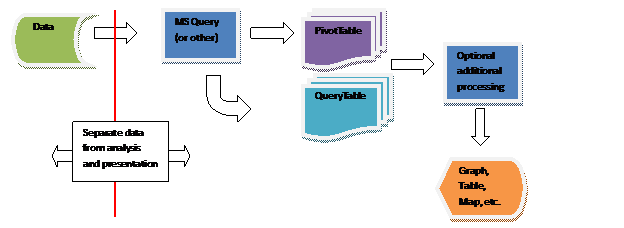 Next, create a new workbook that uses the data workbook as the source for its analysis. My preferred method for extracting data is MS Query, which lets Excel do all the heavy lifting. The result is either a QueryTable or a PivotTable. On several occasions, there is further analysis, which treats the PivotTable or QueryTable as the source.