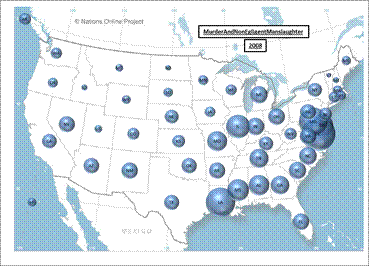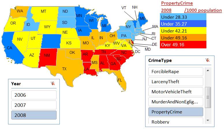 I am a strong proponent of showing data in a way that is natural to the underlying context. I chose a crime statistics data set. It contained the number of acts of different types of crimes for different U.S. cities for the period 2006 to 2008. While one could do something with the city level data, I opted to summarize the results at the state level and display the result in a map of the U.S.