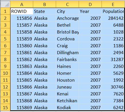 With that research out of the way, I turned to the data set I was using. It contained a list of cities and their characteristics such as the population. A snapshot of the dataset is in Figure 2.