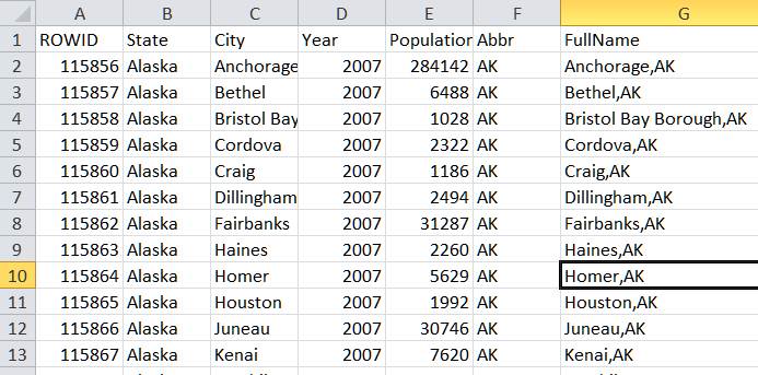 Since I also had a list of state names and their corresponding state abbreviations, I used a VLOOKUP function to add a column with the state abbreviation and, for convenience, create a “full address” in another column.
