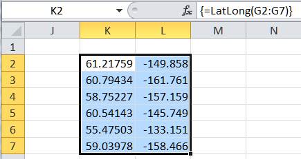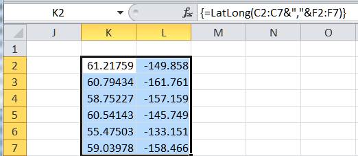 First, one could call it with a single address such as a cell reference that contains {city},{state abbreviation} as in =LatLong(G2) or where the address is the result of a formula as in =LatLong(C2&”,”&F2).