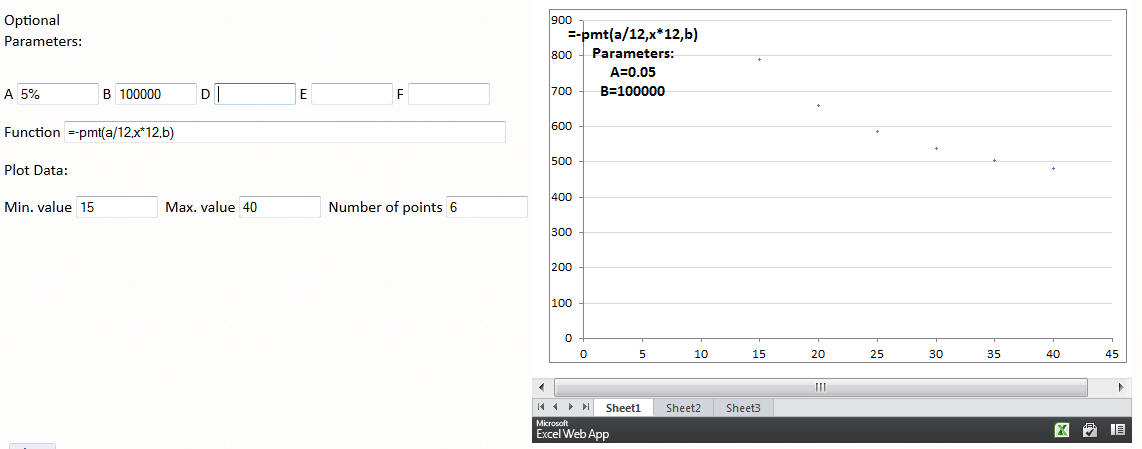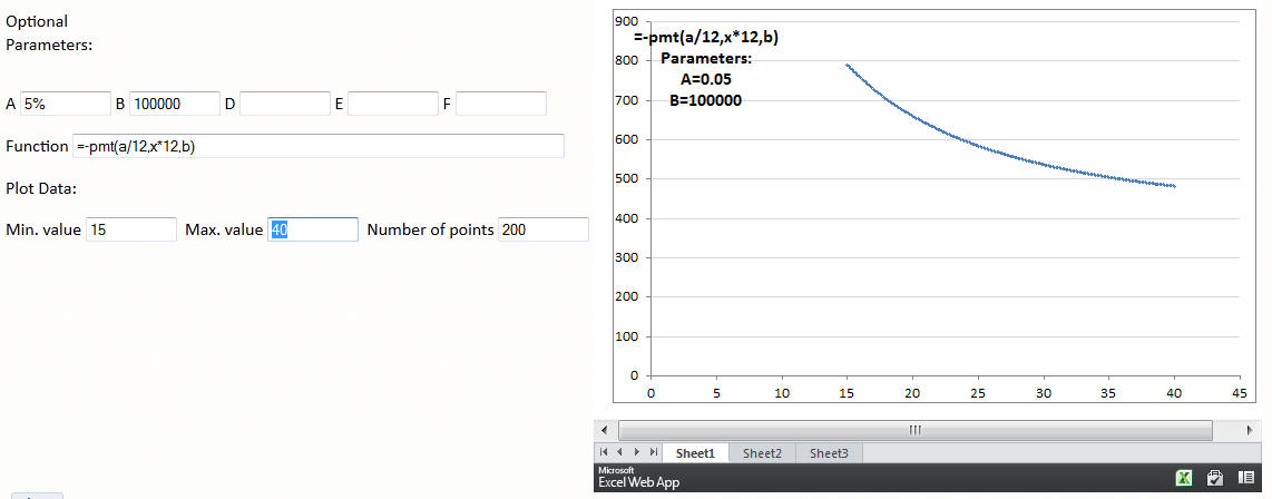 Update the various fields in the form below and simply TAB or ENTER to update the graph. As an example, to see how the monthly payment for a mortgage would vary with the duration of the mortgage, do the following: designate A as the annual interest rate and B as the principal. So, enter, say 3% in A and 100,000 in B. Then, in the formula field enter =-pmt(A/12,X*12,B). Finally, set the min. value to 15, the max. value to 40, and the number of points to, say, 200. For more see Monthly mortgage payment as a function of the loan duration.