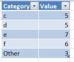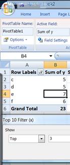 This tip illustrates two ways to get the desired result. The first approach is easy to implement but it does not scale if the Top 10 list changes in length as might happen if one were to customize the 10 or if there are multiple categories in the last place in the list all with the same value in which case there will be more than 10 items in the list. In the example below, the PivotTable shows a Top 3 list. However, because what would be in the 3rd place has two categories, each with a value of 5, the list consists of 4 items.