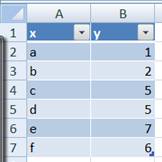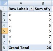 From this create a PivotTable where the column labeled 'x' is the Row Field and the column labeled 'y' is the data field. By default Excel puts the PivotTable on a new worksheet and creates a Sum statistic, both of which are just fine for this analysis.