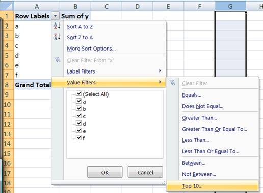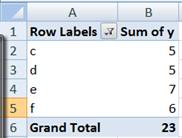With the basic PivotTable constructed, we can start on the actual task at hand. For starters we need to know the total of all the elements not shown in the above PT. This is relatively easy since it is the difference between the sum of all the elements less the Grand Total shown above. To get the total for all the elements, create a 2nd PivotTable that has the y column as the data field but no row field or column field.