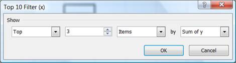 With the PivotTable in place, select the Row Labels drop down then the Value Filters submenu and finally the Top 10... filter as shown below. In the dialog box, change the default Top 10 to Top 3.