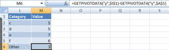 In L6 enter the word 'Other' and in M2 enter the formula shown below. The easiest way to do this is to enter the = key, then click the mouse in the cell containing the data in the 2nd PT (I2 in the example above), the - key, and finally click the mouse in the cell with the Grand Total in the 1st PT (B6 in the above example).
