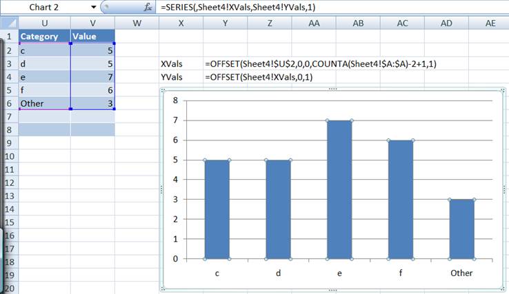 Finally, to create a dynamic chart, use the usual technique. Create two names as shown below and use them in the chart.