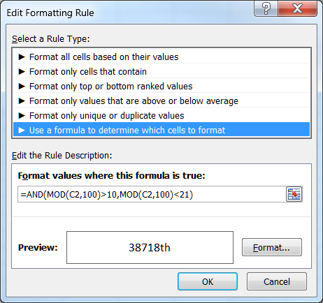 In the Edit Formatting Rule dialog box, select Use a formula to determine which cells to format and enter the formula =AND(MOD(C2,100)>10,MOD(C2,100)<21). Then, click the Format… button to specify the conditional format.