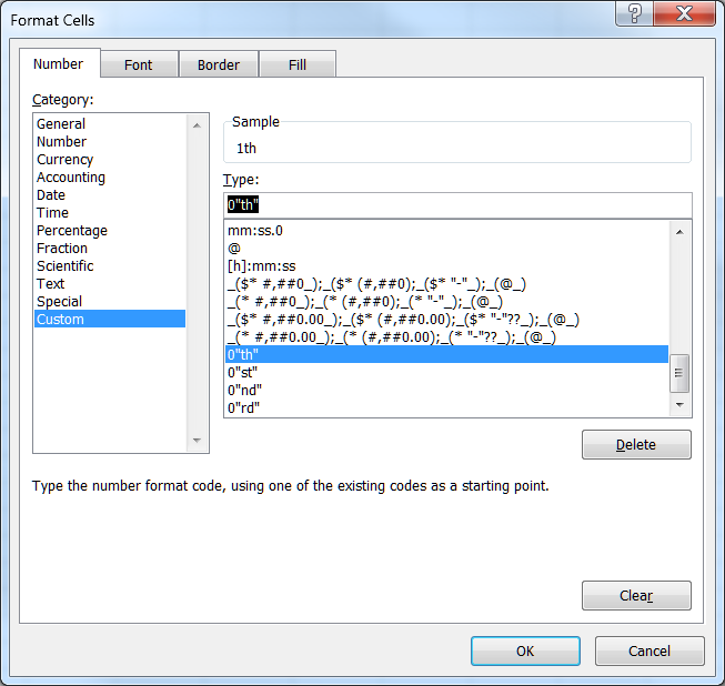 In the resulting Format Cells dialog box, select the Custom category, and enter the custom format 0"th".