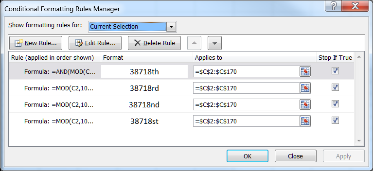 Actually, there are three conditional formats, one for each of the “st,” “nd,” and “rd” suffixes.