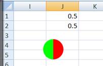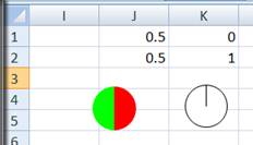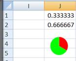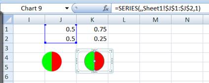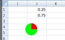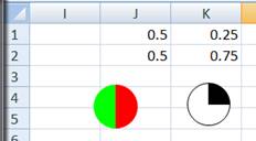 Another advantage of using a chart to represent a Harvey Ball is that we are not restricted to a few predefined shapes, in all of which the pie wedges are multiples of 1/4 of the circle's perimeter. We can easily create any size wedges. For example, to create a 1/3rd pie wedge, change the value in J1 to the formula =1/3.