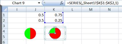 To create a second Harvey Ball, copy the formula in J2 to, say, K2. In K1 enter some number between 0 and 1, say 0.75. Next, copy and paste the chart so that there is a second pie chart in the worksheet.