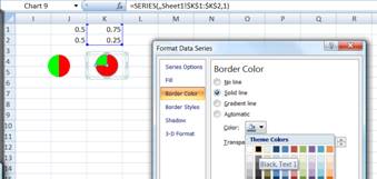 To create the traditional black-and-white balls is a little difficult since we have removed the border. One obvious solution is to reinstate the border of the data series. However, that will mean that the circle will not be perfect when the ball has just one color. Try it yourself. Select the data series of the 2nd pie chart and format the border to, say, black.