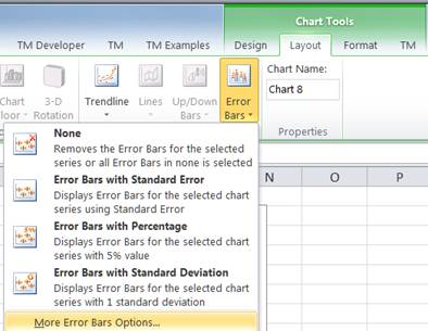 Add error bars: Select the plotted series, then Chart Tools context ribbon | Layout tab | Error Bars dropdown | More Error Bars Options… button.