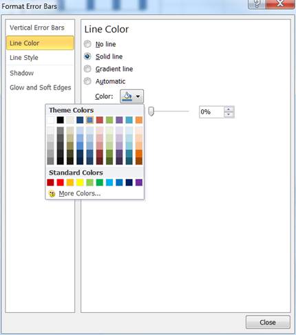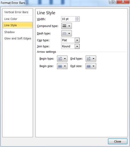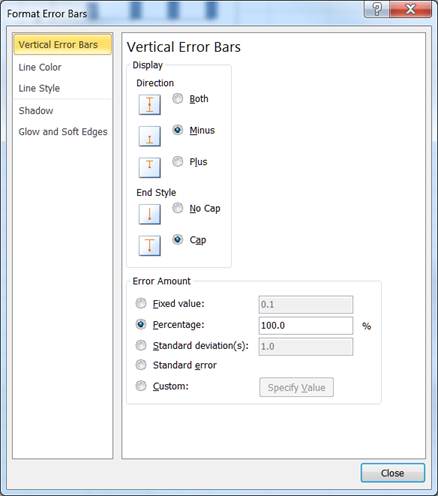 In the resulting dialog box, select 100% Negative error bars, change the Line Style width to 10pt, and format the line color as desired.