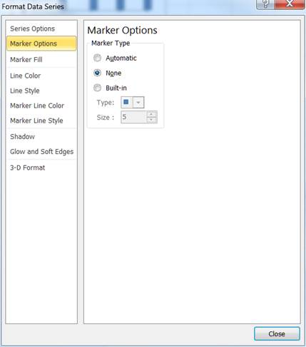 Format the series to have no marker: In Excel 2010, double-click the plotted series (in 2007 right-click and select Format Data Series…) and from the Marker Options tab, change the Marker Type to None.