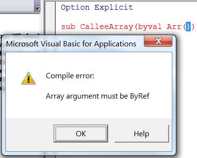 So far we have looked at a simple variable and an object variable. In the case of an array variable, the language disallows the use of a ByVal parameter. As shown below, declaring an array parameter as ByVal results in a syntax error.