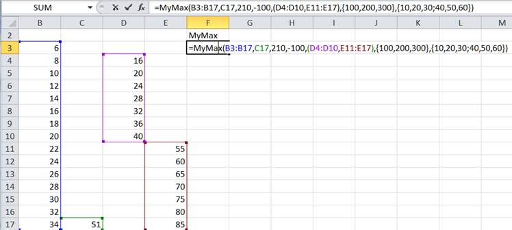 Debug.Print MyMax(Range("A1:A10"), Array(10, 20, 40))