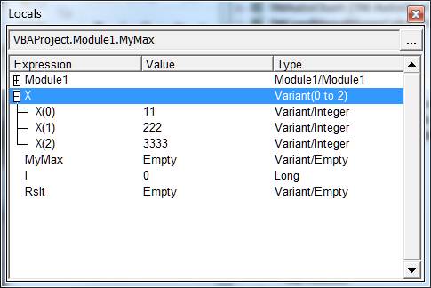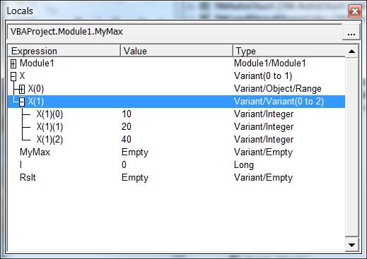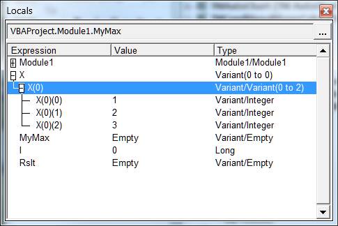 So, in the above example, the first call to MyMax will have X as a one element array. That one element will contain an array, where the three elements of the array are the values 1, 2, and 3, respectively. Since X is an array and the first element of X is an array, 2 indexes are required to access each value, e.g., X(0)(0) – see Figure 1, which shows the Visual Basic Editor’s Locals Window while executing code in the MyMax function.