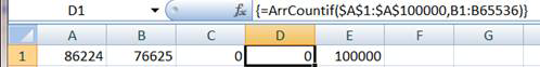 To use the ArrCountIf function with the model described above, select D1:D65536 and array enter the formula =ArrCountif($A$1:$A$100000,B1:B65536). To array-enter a formula select the range that will contain the formula, enter the formula, and complete it with the CTRL+SHIFT+ENTER combination rather than just the ENTER or TAB key. If done correctly, Excel will show the formula bracketed in curly brackets { and }.