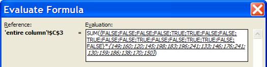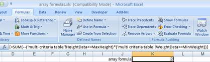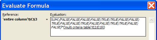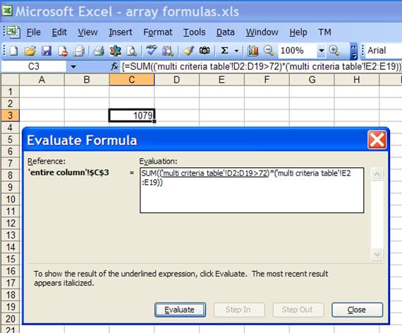 Even before exploring the first array formula, it will help to know how Excel’s Evaluate Formula capability interacts with an array formula. For those who don’t know about this capability of Excel, it is an incredibly powerful feature that, frankly, is not well known. Accessed via Tools | Formula Auditing ► Evaluate Formula (or via the Evaluate Formula button on the Formula Auditing toolbar) or in Excel 2007 from Formulas | Formula Auditing | Evaluate Formula button, it lets one understand how Excel will evaluate a formula. And, best of all, it is array-aware. When evaluating an array formula, it will correctly interpret the array components. It is probably easiest to understand this Excel feature with an example. Suppose that in a worksheet named multi criteria table, column D contains the heights of students and Column E contains their respective weights. Consider the following array formula that sums the weights of all those who are taller than 6 feet (i.e., 72 inches). At this point, don’t worry about how the formula came into being. Just concentrate on how it is evaluated.