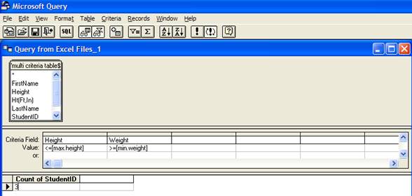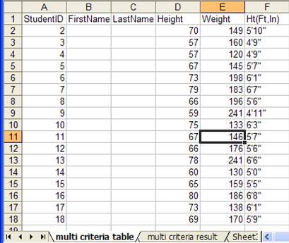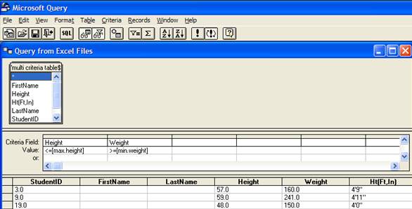 SELECT `'multi criteria table$'`.StudentID, `'multi criteria table$'`.FirstName, `'multi criteria table$'`.LastName, `'multi criteria table$'`.Height, `'multi criteria table$'`.Weight, `'multi criteria table$'`.`Ht(Ft,In)`