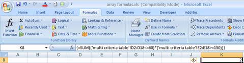 This form of an array formula is most often used to carry out some statistical evaluation of a subset of data organized in a tabular form as shown in Figure 2 where the subset is generated based on a criterion involving more than a single column. It is even more useful when combined with a named formula that identifies a variable-sized range. Of course, a SQL query (easily generated through the use of MS Query via Data | Import External Data > New Database Query… ) will provide the same result and, actually, more that is not even possible with native Excel formulas.